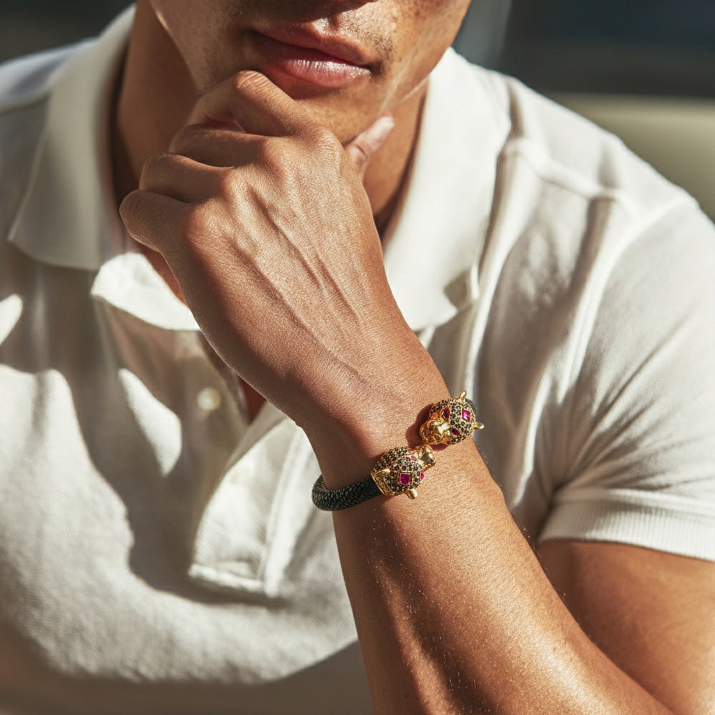 Each piece features a sculpted form, confident proportions, and meticulously handset gemstones that catch the light with purpose. The strap selection showcases only the world’s most exceptional exotic leathers—stingray, crocodile, python, and ostrich—chosen for their rarity, texture, and enduring luxury.Every bracelet is finished with high-micron gold plating, ensuring lasting brilliance and a perfect fit around the wrist. Veles is more than an accessory—it is a declaration of presence and personal style.