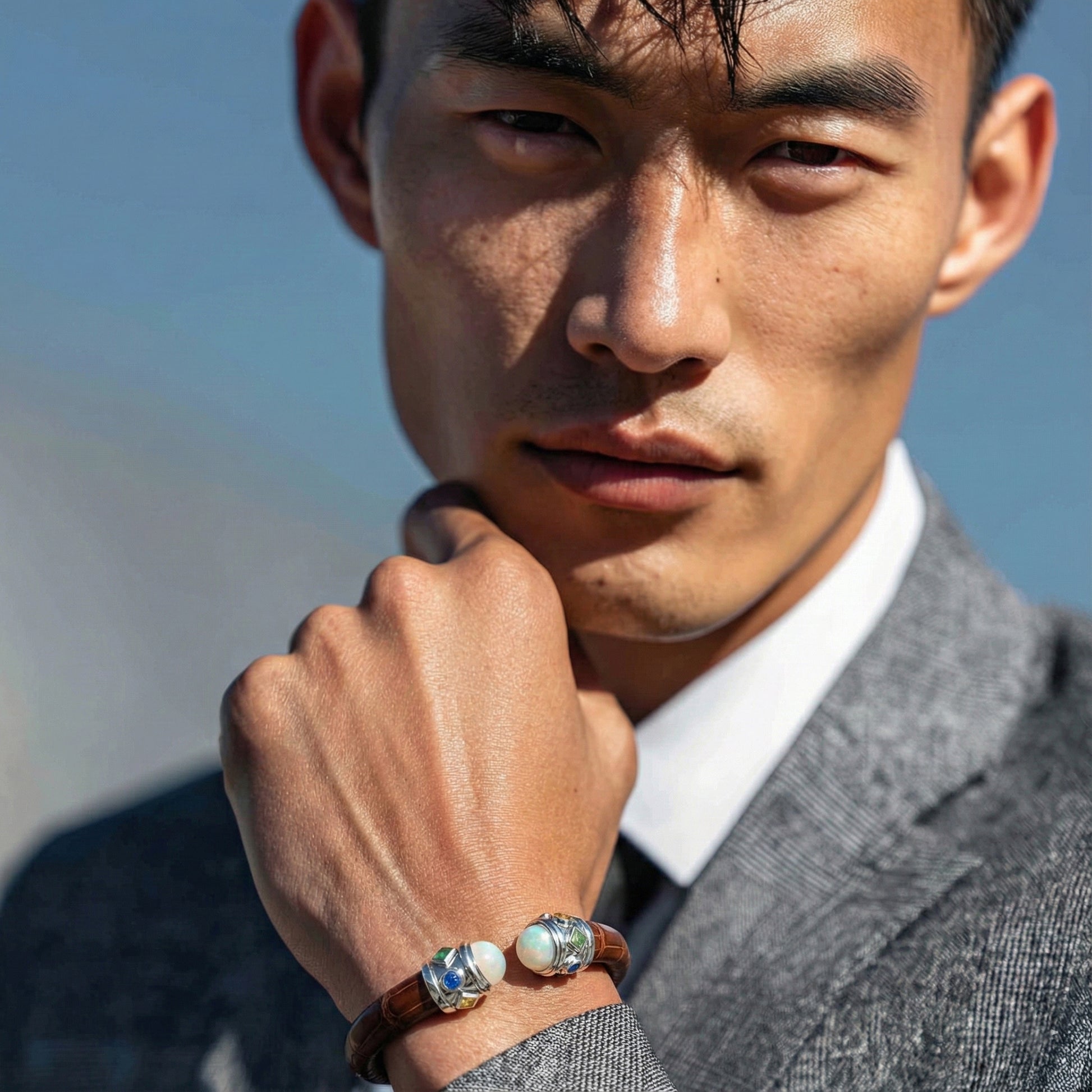 8mm Natural Gemstone Cabachon with Fancy Sapphires and Exotic Leather
