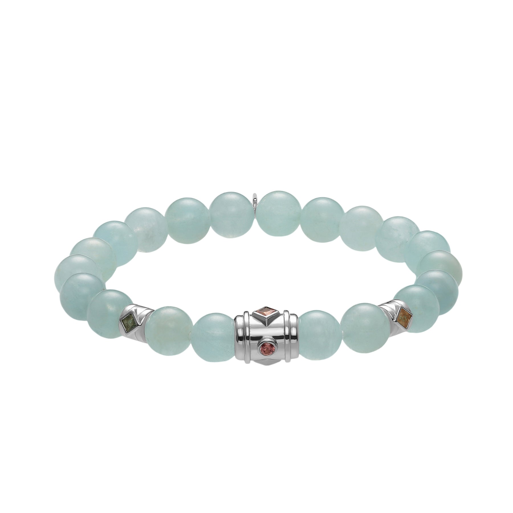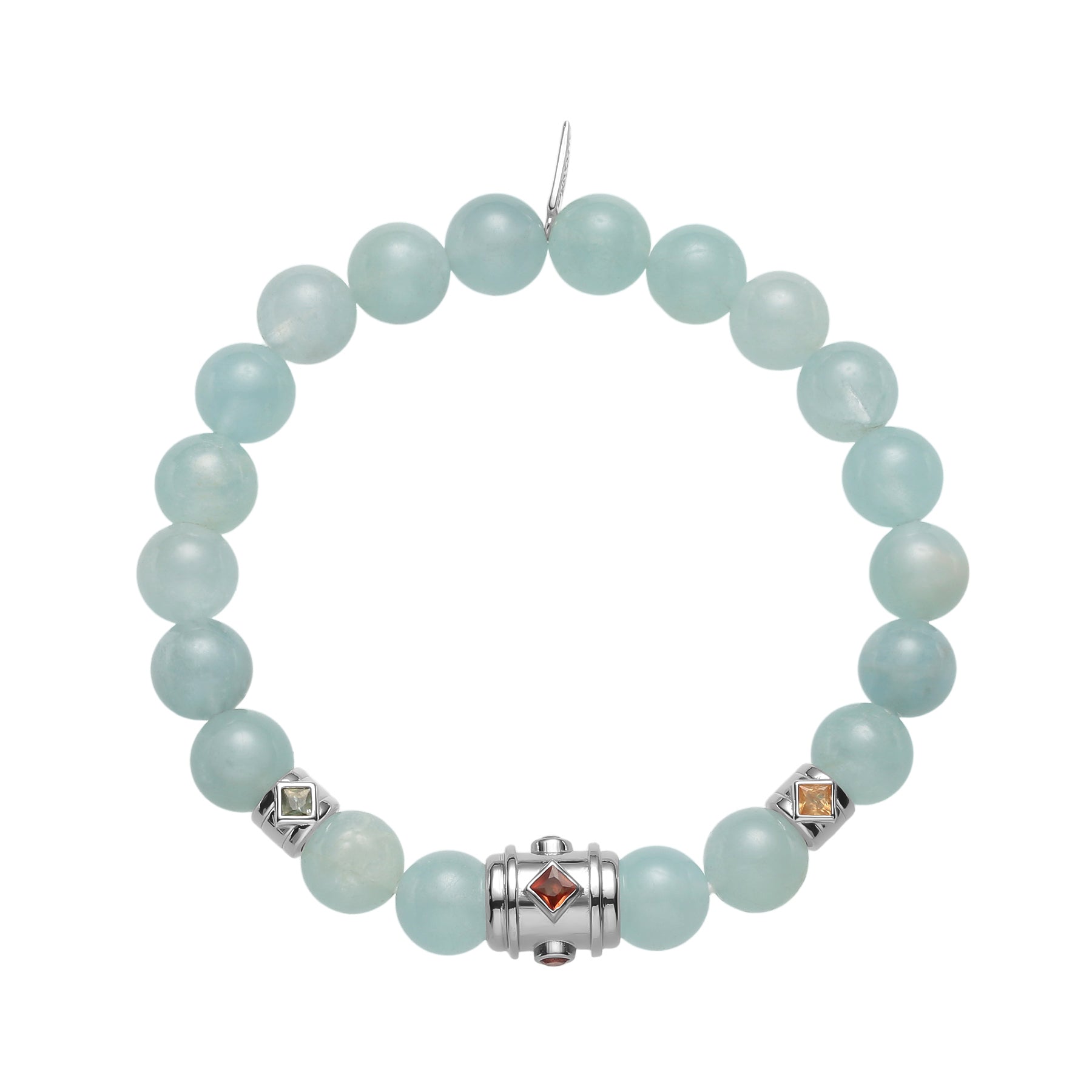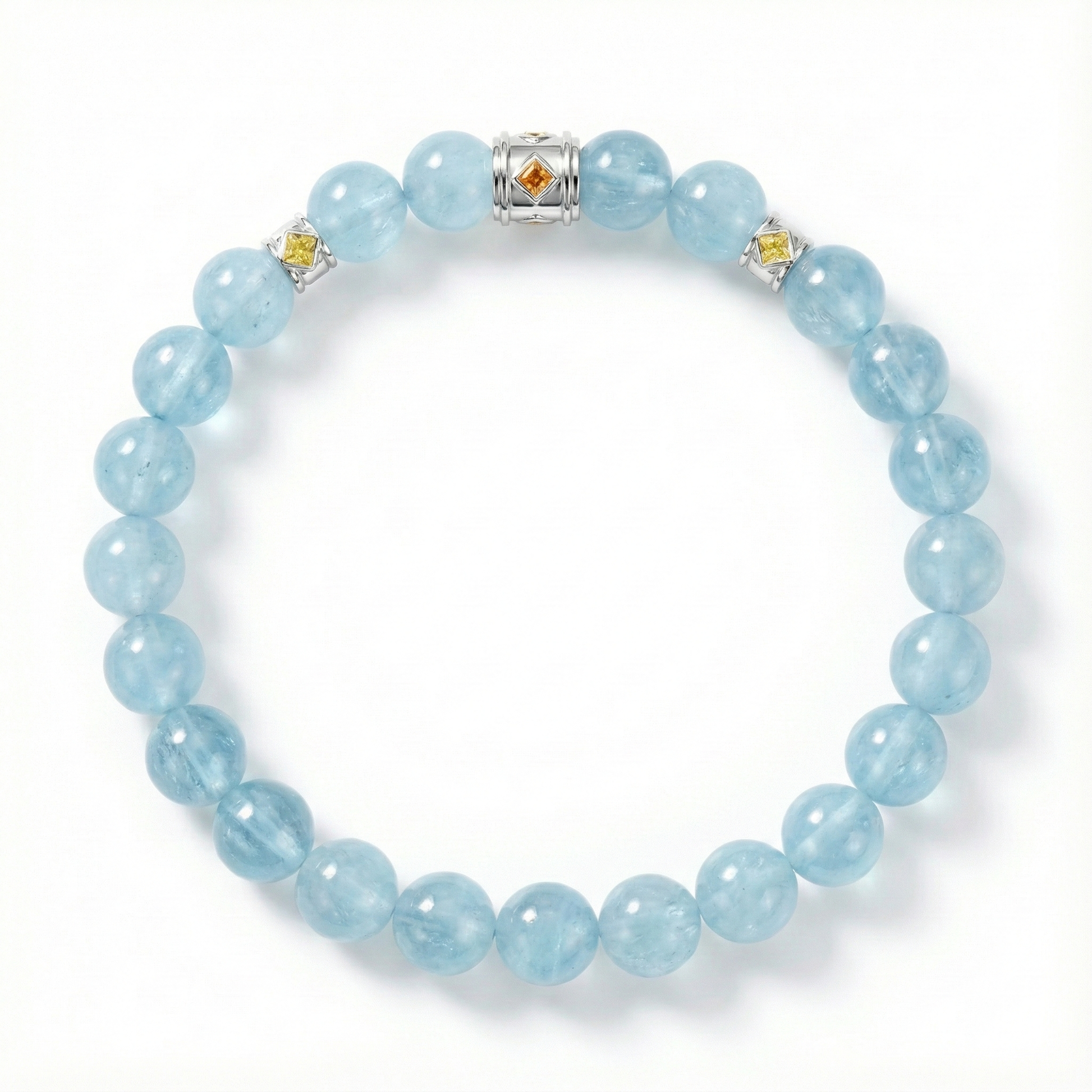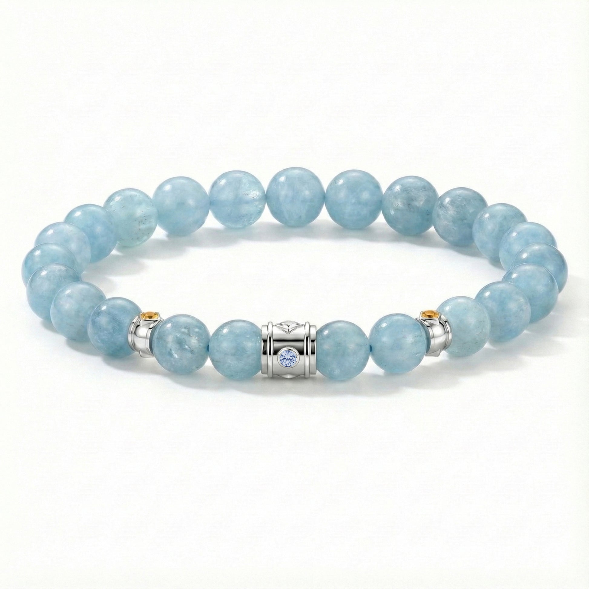 Aquamarine is a serene blue to blue-green gemstone that evokes the clarity and calm of ocean waters. A member of the beryl family, it is prized for its transparency, brilliance, and refreshing color. Traditionally associated with courage, tranquility, and safe travels at sea, aquamarine adds an elegant, airy sophistication to bracelets