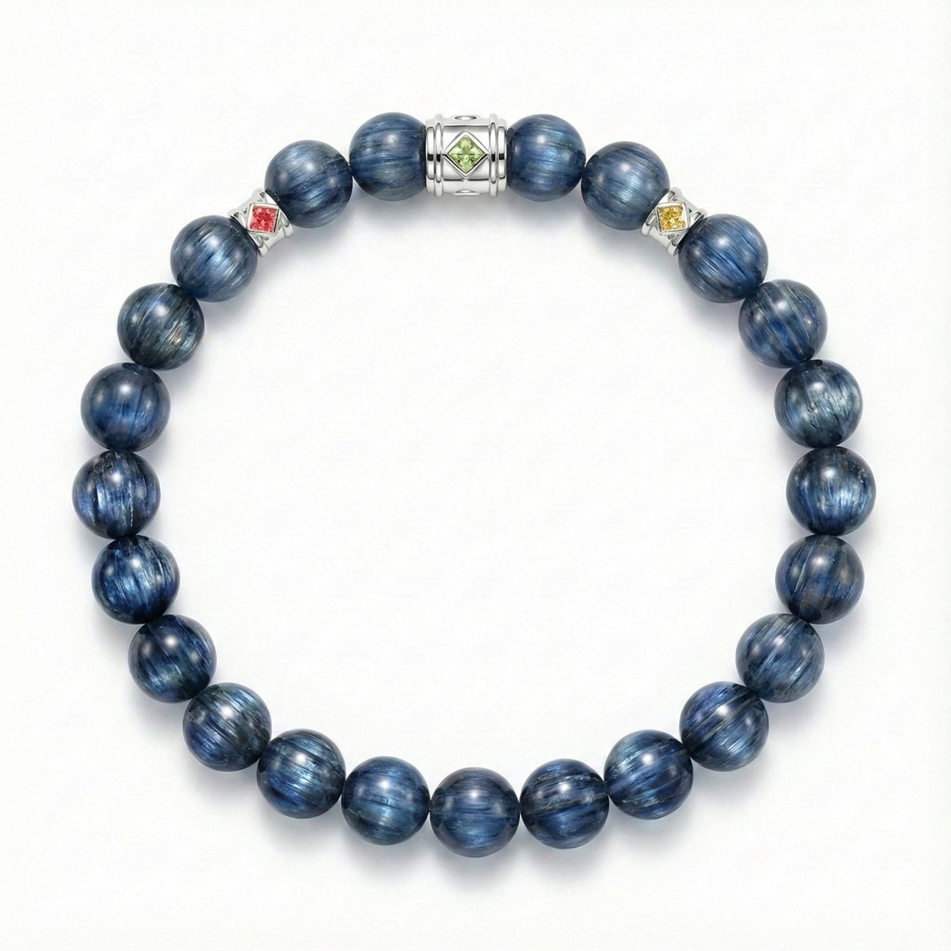 Kyanite is a striking gemstone known for its deep sapphire-blue color and unique, blade-like crystal formations. Valued for its calming energy and association with communication and intuition, kyanite is also notable for its natural shimmering luster and alignment properties — it typically requires no cutting or shaping. A rare and elegant stone, it adds depth and distinction to the bracelet.