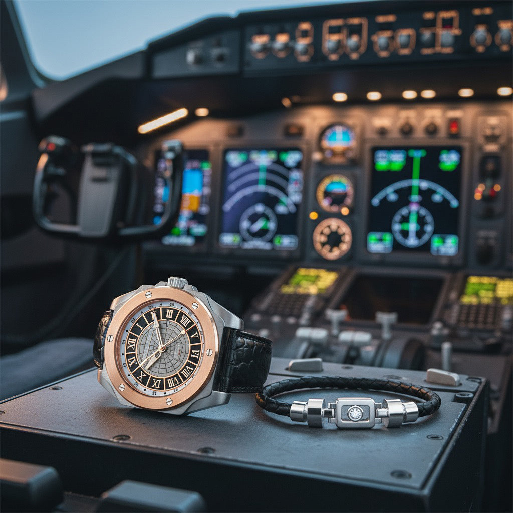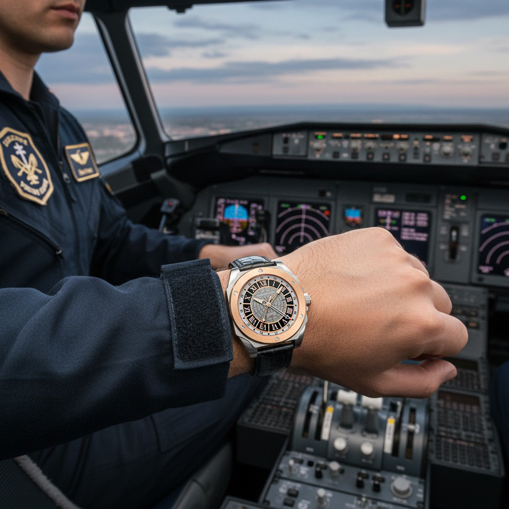 A highly legible GMT indicator—subtly referencing cockpit gauges—ensures instant readability without distraction. This aviation-inspired clarity has earned the collection loyal endorsement from commercial pilots, frequent flyers, and elite military personnel alike.