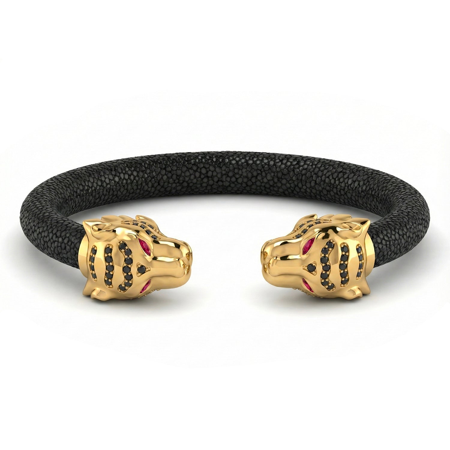 Each piece features a sculpted form, confident proportions, and meticulously handset gemstones that catch the light with purpose. The strap selection showcases only the world’s most exceptional exotic leathers—stingray, crocodile, python, and ostrich—chosen for their rarity, texture, and enduring luxury.Every bracelet is finished with high-micron gold plating, ensuring lasting brilliance and a perfect fit around the wrist. Veles is more than an accessory—it is a declaration of presence and personal style.