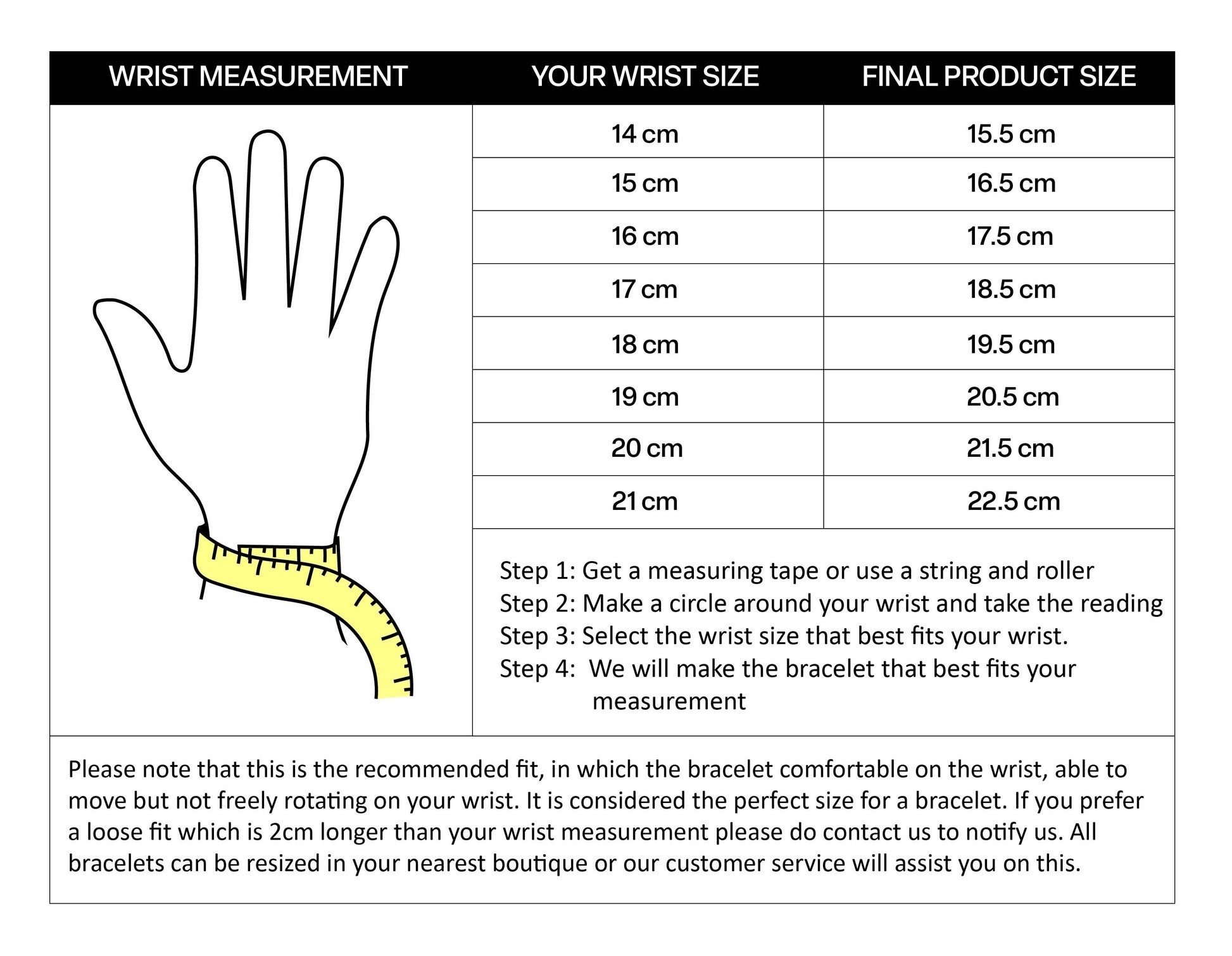 **Measure your bracelet wrist size and provide us with your measurement in your selection during the purchase, our optimal rule is to customize the strap with 1.5cm allowance for a comfortable snug fit but should you prefer a loose fit do let us know**
